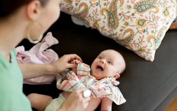 Mluvte na své dítě nahlas při běžné každodenní činnosti, i když to, co říkáte, zní směšně (např. „Maminka teď hledá modré ponožky!“). Když jste venku a pohybujete se v novém prostředí, neustále mu vyprávějte, aby se seznamovalo s novými výrazy (např. „Podívej se na ty hezké kytičky v parku!“).