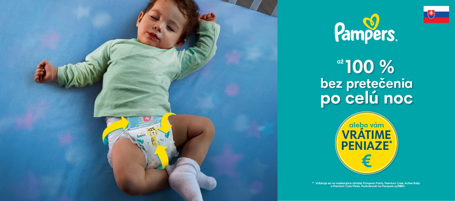 Kúpte si vyššie uvedené výrobky Pampers v období od 1. 1. 2024 do 31. 12. 2024 v akejkoľvek predajni v Slovenskej republike (vrátane online nákupov). Uschovajte si doklad o kúpe a ak nebudete spokojní kvôli pretečeniu plienky, vrátime vám peniaze. Stačí len zaslať späť formulár na vrátenie tovaru a minimálne polovicu nepoužitých plienok.