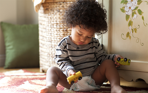 Výborným cvičením, která učí vaše dítě zaměřovat zrak na nějaký předmět, je položit je na zem a přidržet hračku asi 10 centimetrů nad jeho hlavou. Pomalu hračkou pohybujte ze strany na stranu a nechte dítě sledovat ji očima.
